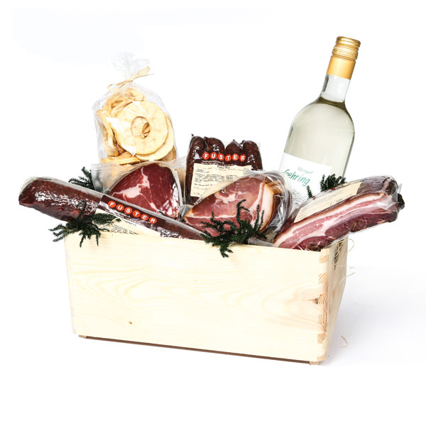 Schönes Holzharassli, satt gefüllt mit Buurespeck, Trockenfleisch und Wurstwaren sowie auserlesenen Produkten aus der Region (Öpfelringli und Wein), saisonal ausgarniert.