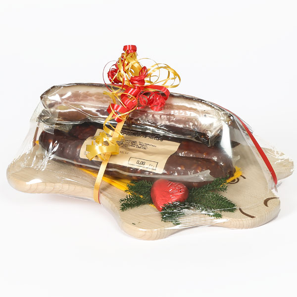 Schönes Holzbrett in Schweinchen-Form mit klassischem Buurespeck sowie Buureschüblig, saisonal ausgarniert, in Folie eingeschweisst.