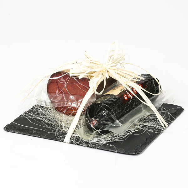 Quadratische Schieferplatte (20×20 cm) mit einem klassischen Mostbröckli vom Rind und einem würzigen Buuresalami aus der Buureräucherei, auf Sisal mit einer Masche ausgarniert.