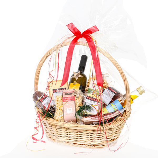 Schöner Flechtkorb mit Henkel, satt gefüllt mit auserlesenen Spezialitäten: Trockenfleisch und -würste, Käse, Wein, Dörrfrüchte, Pasta, Bouillon und Rapsöl, saisonal ausgarniert und in Folie.