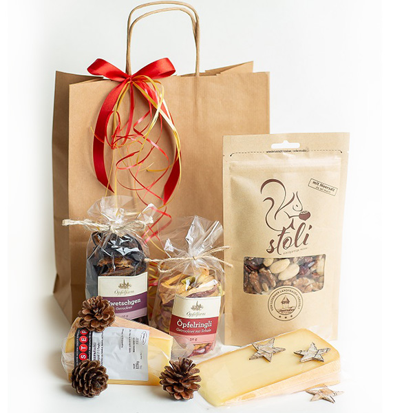 Geschenktasche mit verschiedenen Käse, Dörrfrüchten und Apéronüssen, mit Masche dekoriert und saisonal ausgarniert.