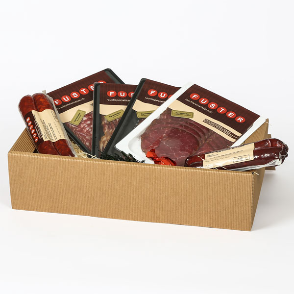 Geschenkschachtel mit geschnittenen Rauchspezialitäten: Mostbröckli vom Rind, Landrauchschinken, Buurespeck, Buuresalami und je ein Paar Chnoblischüblig und Buureschüblig Pikant sowie mit Öpfelringli, saisonal ausgarniert.
